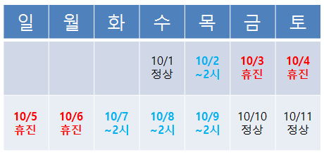 개천절과 추석 연휴가 주말을 끼고 이어져서 연휴가 길어졌습니다. 10월 3일부터 10월 6일까지 휴진, 10월 7,8,9일은 오후 2시까지 진료하니 내원 시 참고 바랍니다.
